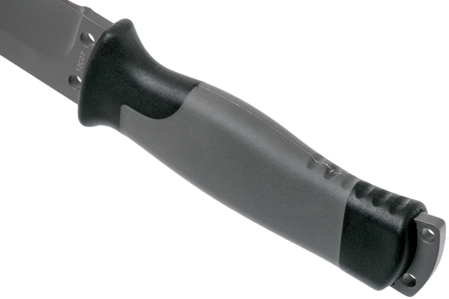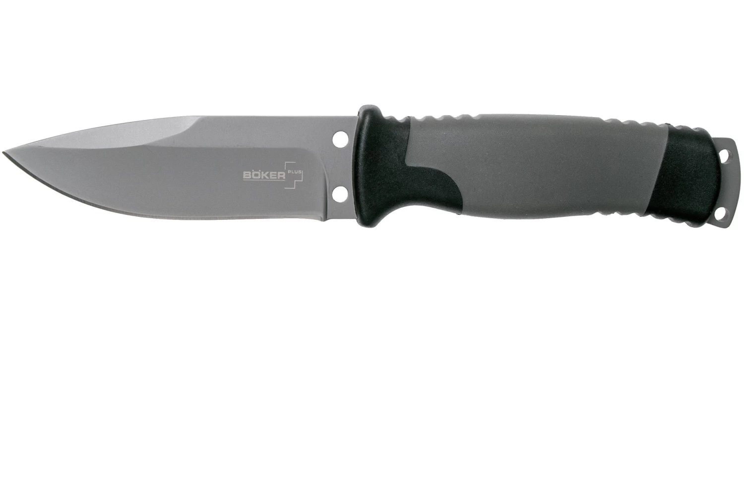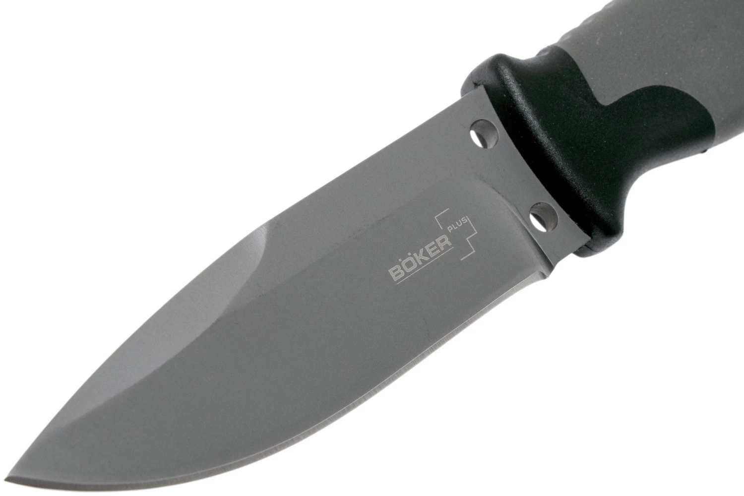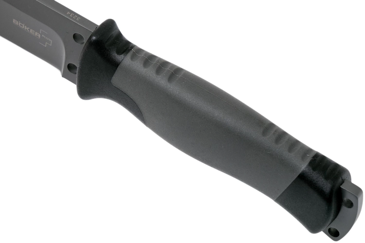 El Böker Plus Outdoorsman es un cuchillo fijo asequible para uso en exteriores. El mango de goma se siente muy bien en la mano y ofrece suficiente agarre. Debajo de una capa de goma se encuentra un núcleo de plástico sólido para una sensación de solidez. La hoja está hecha de acero Sandvik 12C27. Un tipo de acero inoxidable que conserva bien su afilado y además es fácil de afilar. En el extremo del mango sobresale una parte de la espiga de acero. Puedes utilizar esta parte como un martillo improvisado.