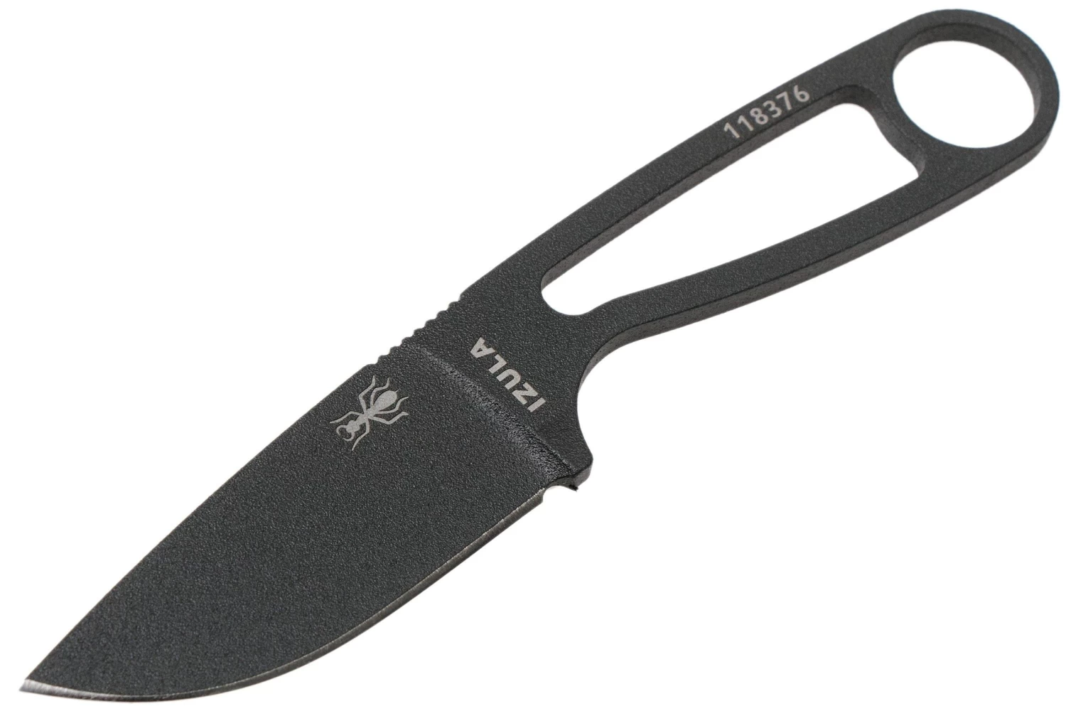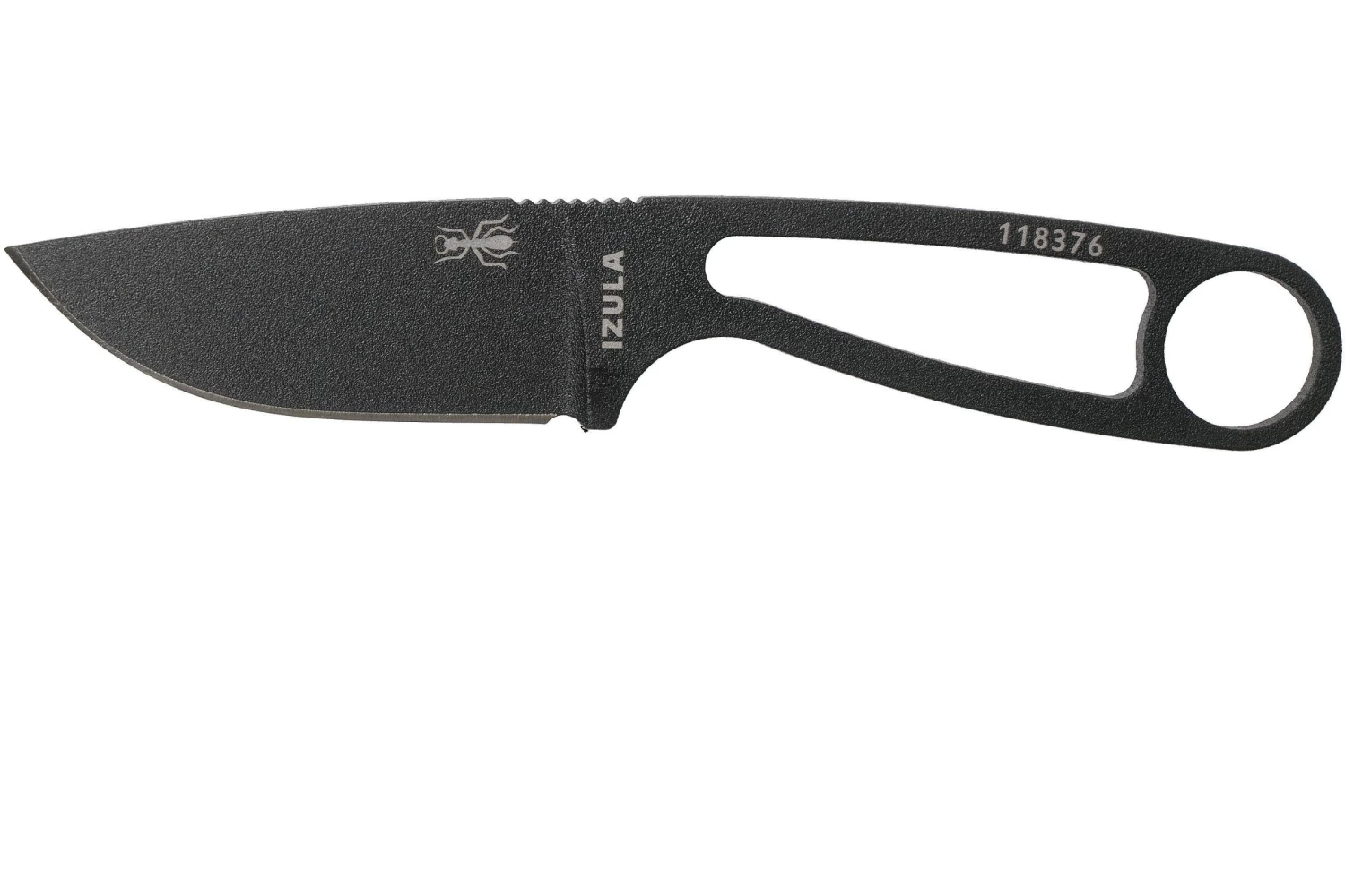 El ESEE Izula Tactical Gunsmoke lleva el nombre de una agresiva hormiga de la selva peruana. Esto es para enfatizar que a pesar de su tamaño no hay que subestimar este cuchillo. El ESEE Izula es un cuchillo fijo versátil. Encontrarás fácilmente un lugar en un bolso o mochila o puedes llevarlo como cuchillo de cuello. A pesar de su tamaño se puede sostener fácilmente. En la parte posterior encontrarás una gran abertura para el dedo meñique para asegurarse de que tienes un excelente agarre. Por supuesto, también podrías hacer un mango de paracord para aumentar el agarre. Y si prefieres un mango real, ESEE también los suministra como accesorio. Esto, por supuesto, hará que el cuchillo sea un poco más grueso.