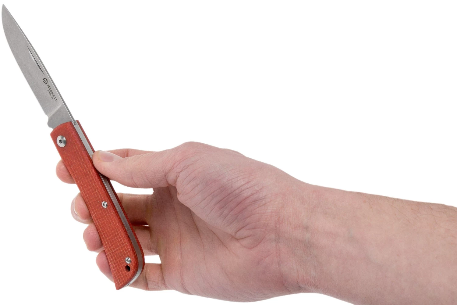 La Maserin Scout es una navaja EDC práctica y compacta. Lo primero que llama la atención es el impresionante mango de micarta de colores. La micarta se compone de capas de lona con epoxi que se comprime a alta presión. De este modo, se obtiene un material de mango muy resistente y bonito. Lo interesante de la micarta es que puede oscurecerse tras su uso. Es el resultado de los aceites de la mano que forman una especie de pátina. ¿Te has cansado de este color oscuro? Basta con desengrasarla con un poco de gasolina y la micarta volverá a estar casi como nueva.