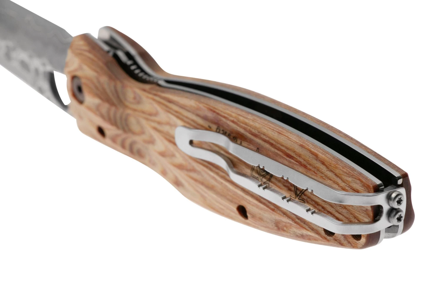 La Mcusta MC-0182G Sengoku Toyotomi Hideyoshi SPG2 es una notable navaja japonesa, con impresionantes detalles. El mango es especialmente bonito. La madera está tallada en 3D para un agarre de aspecto agradable, y esto es funcional también, ofreciendo una mejor tracción. Esta versión tiene una hoja excepcional con un núcleo de acero en polvo SPG2. El SPG2 es un acero extremadamente duro que conserva bien su afilado. El núcleo está laminado entre dos capas de acero más blando. Esto te proporciona las ventajas de la dureza del núcleo, combinada con la flexibilidad del acero laminado. Mcusta terminó este notable acero con un acabado martillado. ¡Realmente especial! El grabado a láser en ambos lados del mango es único: tres flores de paulownia a la izquierda con el nombre de Toyotomi Hideyoshi en caracteres japoneses. Taiko está grabado en el lado derecho. Es un instrumento de percusión japonés. Toyotomi Hideyoshi es uno de los hombres más notables de la historia de Japón. Toyotomi Hideyoshi fue un poderoso señor de la guerra samurái en el Japón del siglo XVI. Las tres flores de paulownia son el kamon o emblema/escudo de armas de Toyotomi Hideyoshi. Él fue uno de los tres señores de la guerra que unieron el Japón feudal.