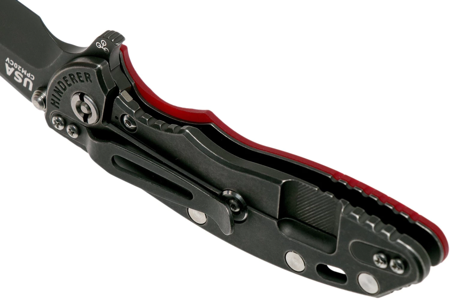 Rick Hinderer XM-18 3.5″ Spanto CPM 20CV Battle Black, Red G10 Navaja