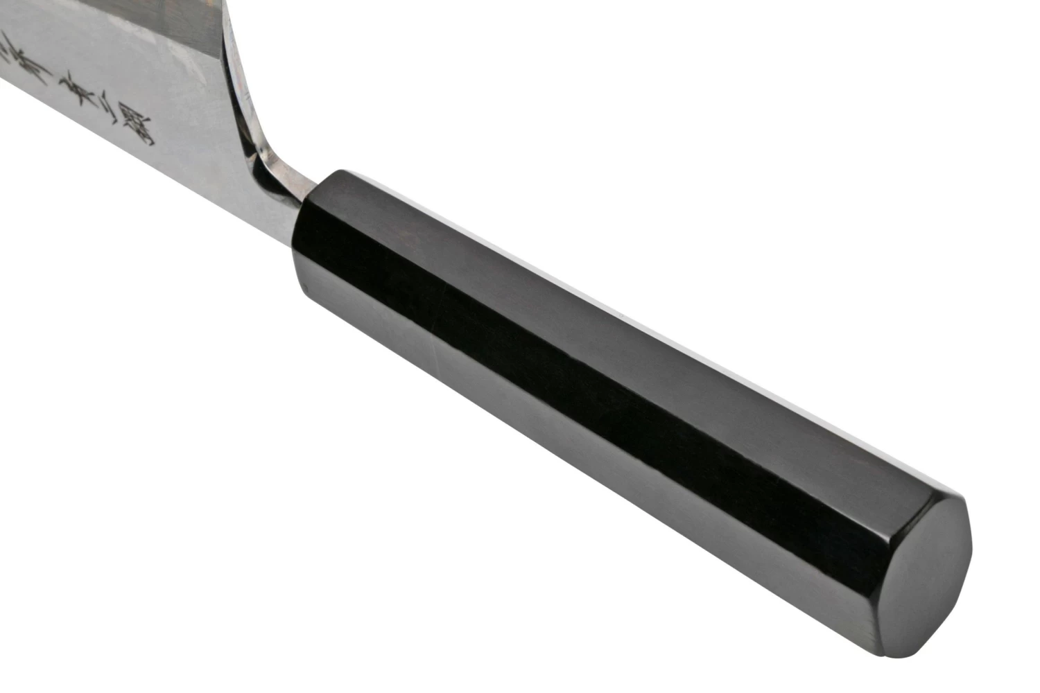 El Sakai Takayuki Blue 2 Steel Japanese Style 01235 deba 15 cm es un pequeño pero robusto cuchillo de cocina japonés. El deba fue diseñado originalmente para filetear y preparar carne y pescado. La hoja es más gruesa que la de un cuchillo de cocina medio, lo que te permite cortar huesos pequeños, ligamentos y tendones sin dañar el filo del cuchillo. Este cuchillo está afilado por un lado, mientras que el otro está ahuecado. Esto asegura que la carne o el pescado no se pegue y se caiga de la hoja con facilidad mientras estás cortando.