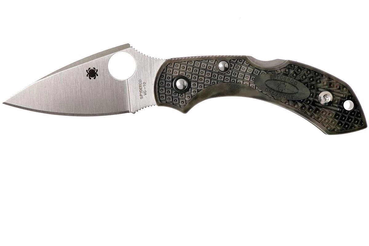 La Spyderco Dragonfly 2 es una navaja compacta y bonita. Como una libélula, esta navaja no pesa casi nada. Pocos otros cuchillos con una longitud de hoja de 5,8 cm pesan únicamente 34 gramos. La hoja afilada está hecha de acero Vg10 y conserva muy bien su afilado. El mango está hecho de FRN: un plástico reforzado con fibra de vidrio que mantiene el peso bajo, pero también es muy fuerte.